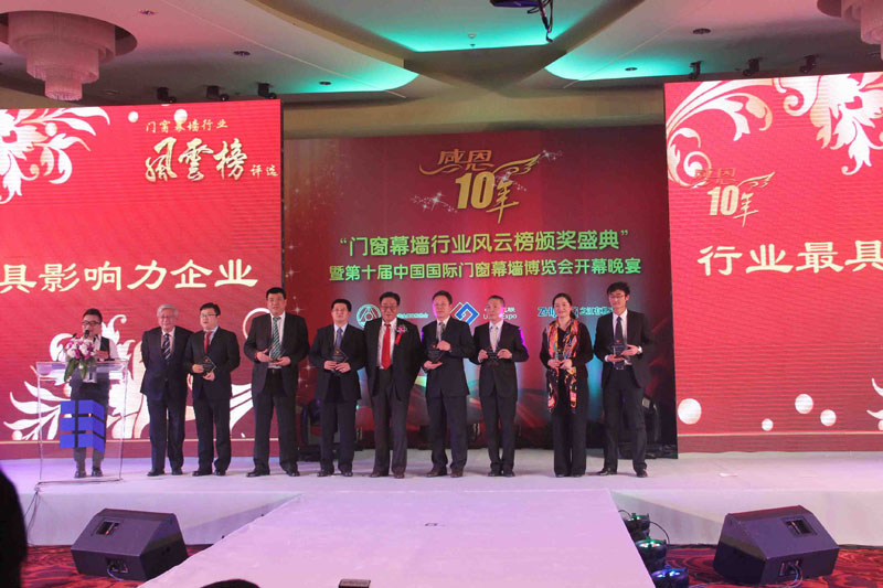 2012年11月23日,由中国建筑金属结构协会主办的“感恩十年——门窗幕墙行业风云榜评选”颁奖盛典在北京举行。经过2个月的激烈角逐,我公司以绝对优势高居加工设备类榜首,荣获一呼百应大奖——最具影响力企业奖。 我公司自成立至今,始终把技术创